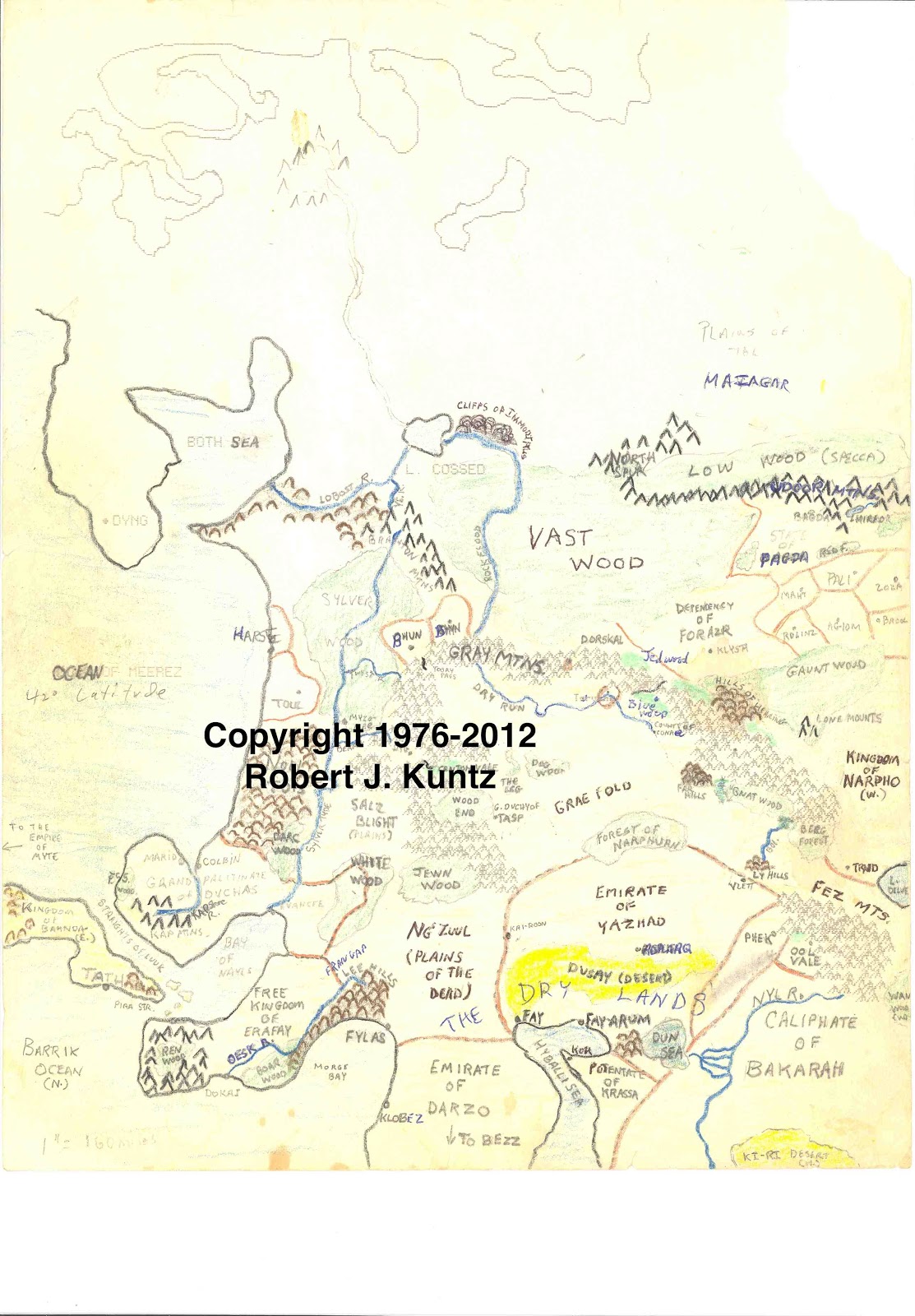 The key features of its 1st iteration are consonant with the 2nd, as I broke with established bottom-up creative patterns and instead concentrated on making the world my own through a top-down approach as first inspired by Tolkien, Clark Ashton Smith in his "world/area cycles" fiction and the then emergent M. A. R. Barker with his glorious Tekumel.